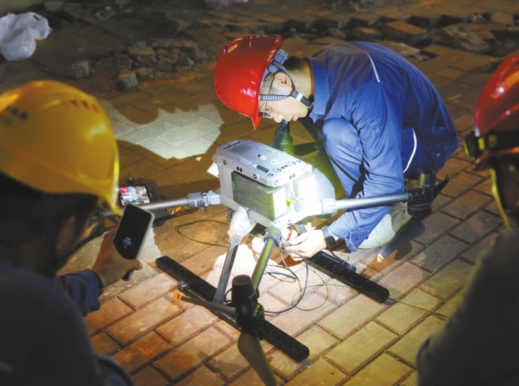 在應急照明燈的照射下,各單位搶險人員合力搶修。