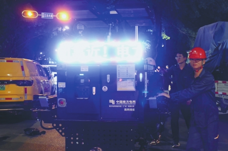 南寧供電局工作人員啟動應急電源車為搶險指揮部24小時供電。